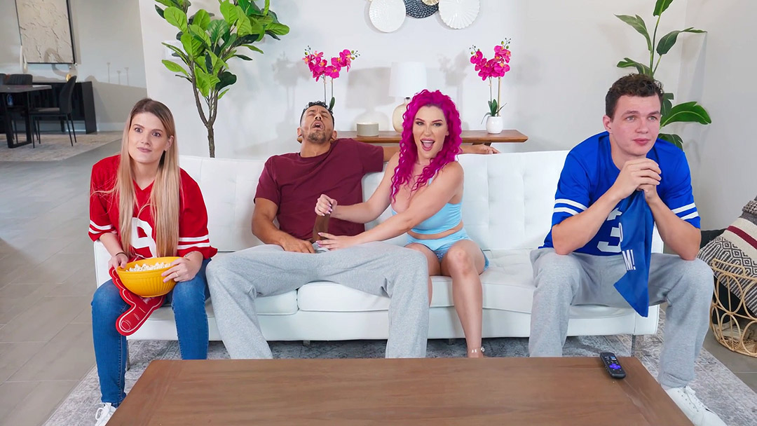 Description: Lily Lou, Alex Jones and their respective partners get together for a double date football night to watch the big game! While their partners are totally into the game though, Lily and Alex only have eyes for each other. Time for some sneaky mid-game fucking!